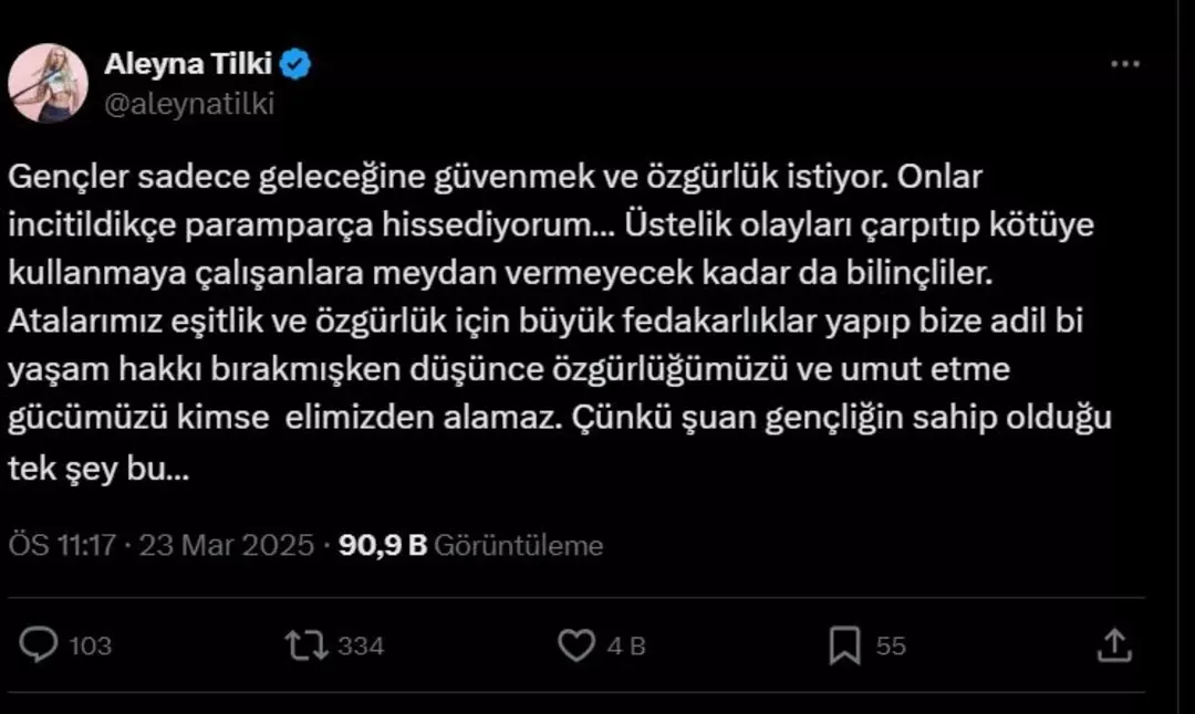 Genç şarkıcı Aleyna Tilki İmamoğlu protestolarına katılan gençlere dair yorumuyla takipçilerini ikiye böldü. “Gençler sadece geleceğine güvenmek ve özgürlük istiyor” diyen Tİlki’ye yorum yağdı.