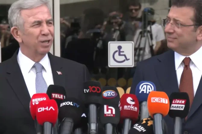 İBB Başkanı Ekrem İmamoğlu ve ABB Başkanı Mansur Yavaş, Ankara’da bir araya geldi. Kameraların karşısına geçen iki başkan, gazetecilerin sorularını yanıtladı. İmamoğlu “Biz birlikteyiz, yol arkadaşıyız, hedefimiz tektir” derken; Yavaş da “Kimse kimsenin yedeği olmaz” dedi. Yavaş, İmamoğlu’yla ilgili diploma soruşturması için de “Buna asıl sayın Cumhurbaşkanı’nın müdahale etmesi lazım diye düşünüyorum. Bu konularda en tecrübeli kendisi” diye konuştu.